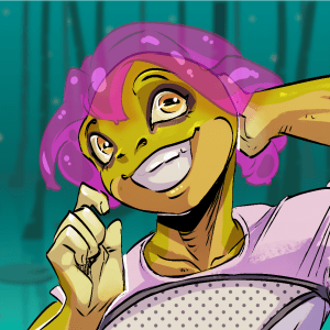 DUVVU squeals, bouncing in their seat, and a momentary flash of a mucous membrane seems to coat their entire body for a moment. They then collect themselves, and their skin returns to its normal matte texture.